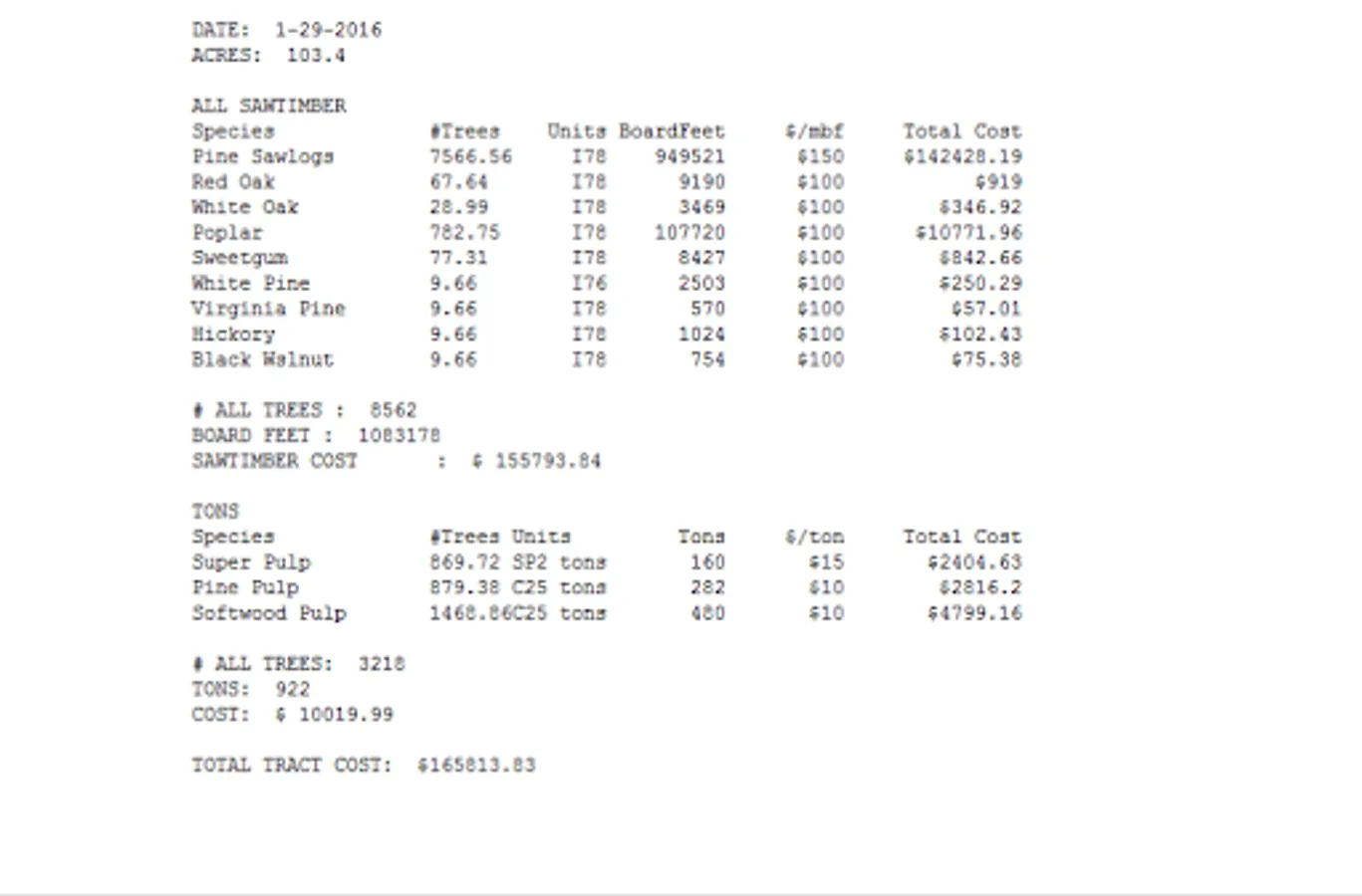 • Nothing too fancy here--No acreage calculations, no multi-product within one tree, no top wood, no crown closure etc.