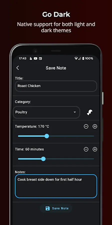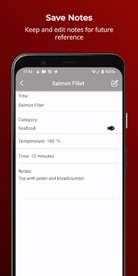 Once saved notes can be updated if you want to add more information or amend the cooking settings, or deleted with a simple swipe.