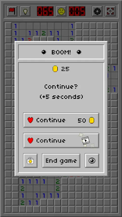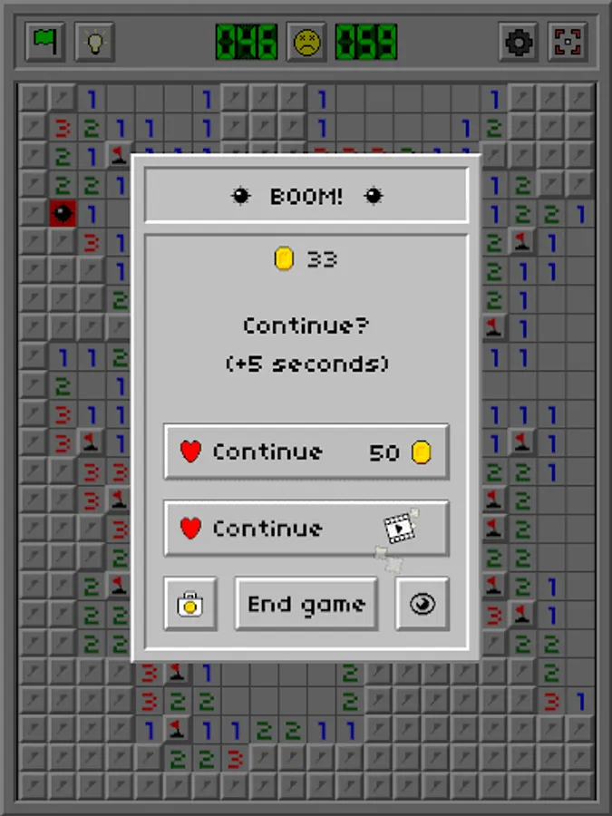 • Continue: If you hit a mine you can continue from where you left off for 50 coins or by watching a video ad
