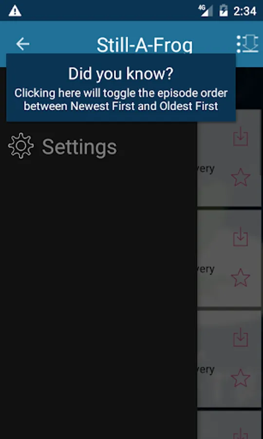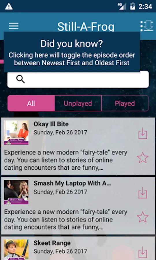 This is the most convenient way to access Still-A-Frog on your phone. With this app you are always connected to the latest episodes and the show. You can also star your favorite episodes and save them to a list so you can easily enjoy them over and over! This app is complete access to Still-A-Frog and if you're a fan of the show you won't want to be without it!