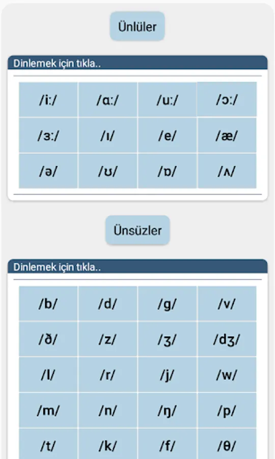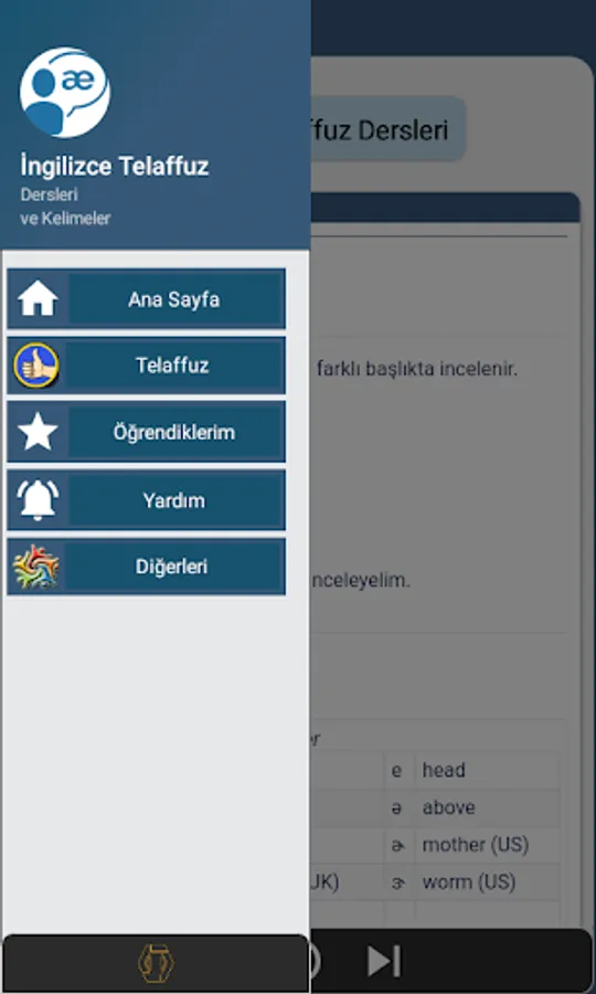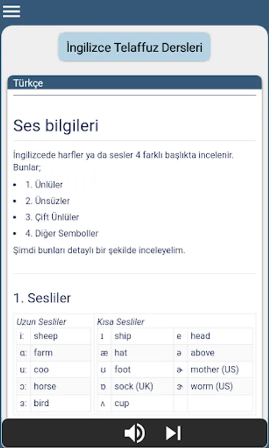 Pronunciation is very important in English. Even if you know 1000s of words, if you cannot pronounce them properly, no one will understand you. Thanks to the lessons in our application, you will be able to speak with very good pronunciation. Thanks to the pronunciation lessons in it, you will learn how to read words when you look at the dictionaries, and you will be able to speak by making these sounds properly like the English, thanks to the lessons that show you how the sounds should be made. In addition, you can memorize hundreds of sample words and sentences by both reading and listening, and you can check how well you say the words you listen to with the Trial button. In addition, thanks to the links in our application, you can reach our applications such as English dictionary, daily dialogues, most used words, verbs, grammar lessons.