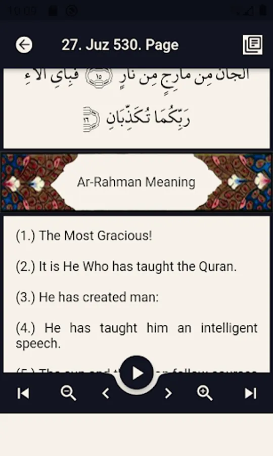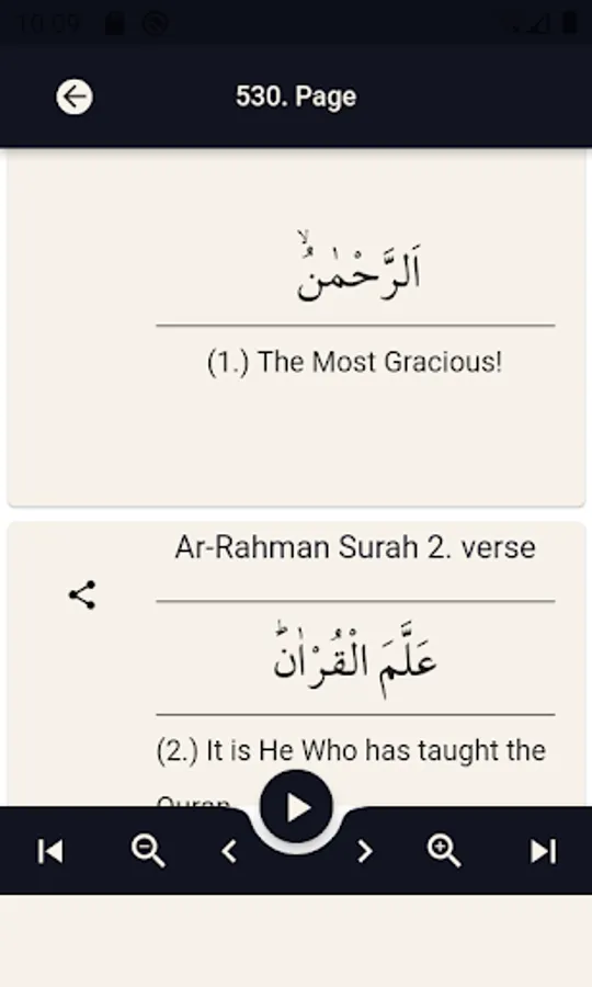 Our holy book the Koran Karim's heart is Yasin, which reduces the grave punishment property (Mulk) Surah An-Naba Surah Rahman and Fatah Surat voice in Arabic and Latin letters, Arabic and English meaning to our application you can find at the same time on the same page, articles If you come with small adjustments according to the zoom button, you can make yourself instantly magnifies the text. The Qur'an also available on special occasions and, in the lamp, if you want it in three months time we read often can listen to audio, you can read the Arabic memorization you want. With Arabic text written in Latin letters do not speak or read Arabic can still make memorization. You can also get the application back and forth, back and forth reading our keys, you can continuously repeat playback using the button again. You can start from the point where you want using the time bar, you can bring a verse you want.