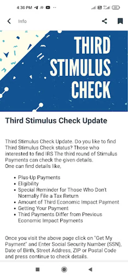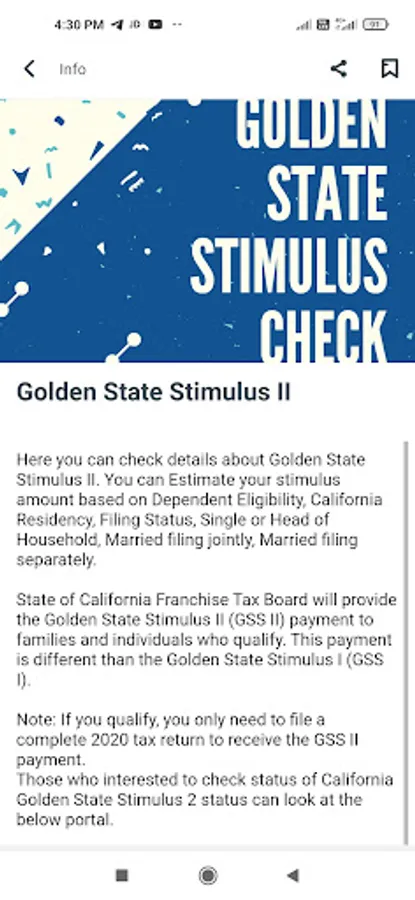 Stimulus Check is an android app that provides details of stimulus check in various states. One can use this app to track the status of your third stimulus check, estimate your payment(California GSS Estimation), Golden State Stimulus, Fourth stimulus check and many more. We will be updating the app with latest news of stimulus check updates.