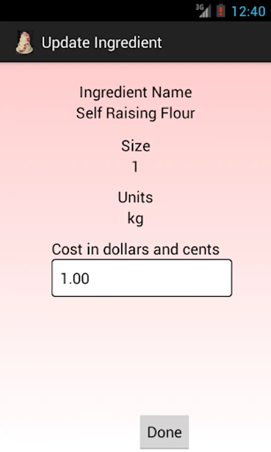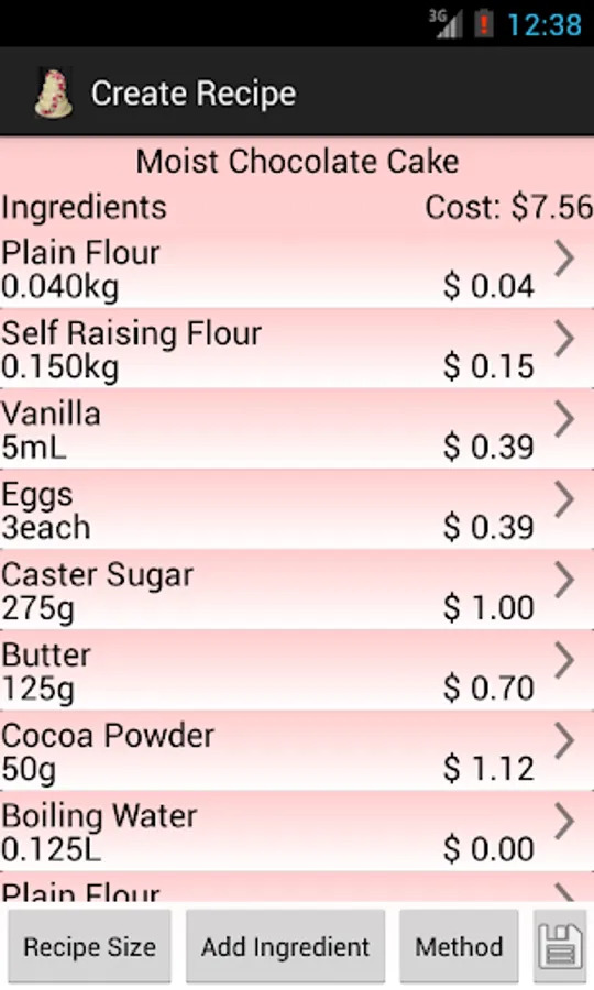 Change the size and shape of the cake and see how much it will cost and the amount of ingredients you will need. Update the cost of ingredients as they change.