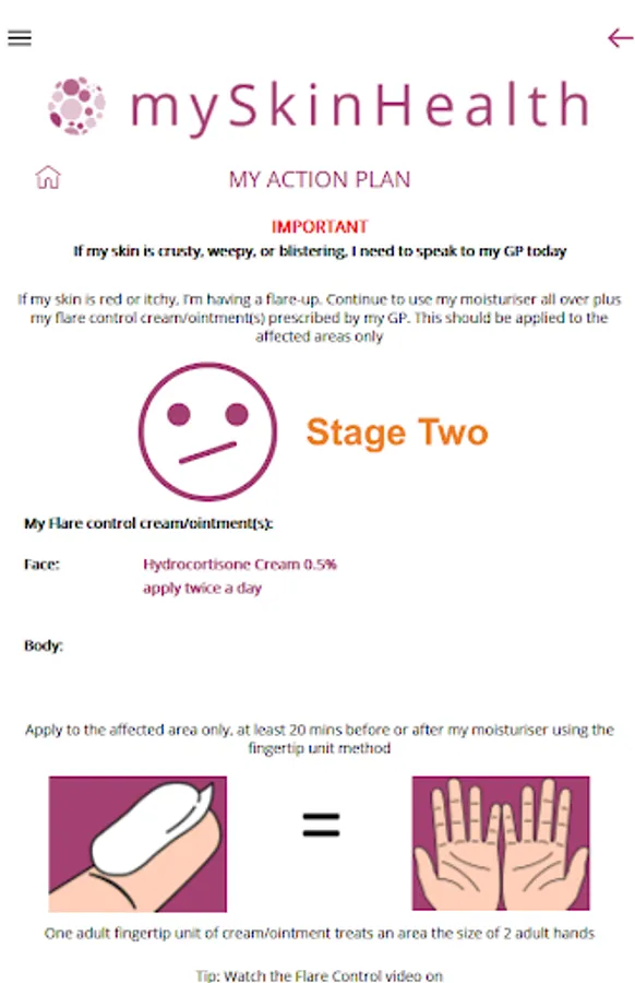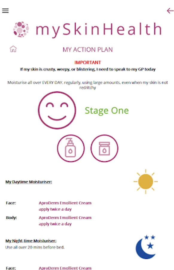 • Your personalised written action plan is your ‘road map’ to improving and managing your eczema and is based on what you tell the app about the treatments that you use