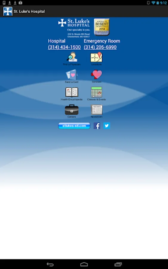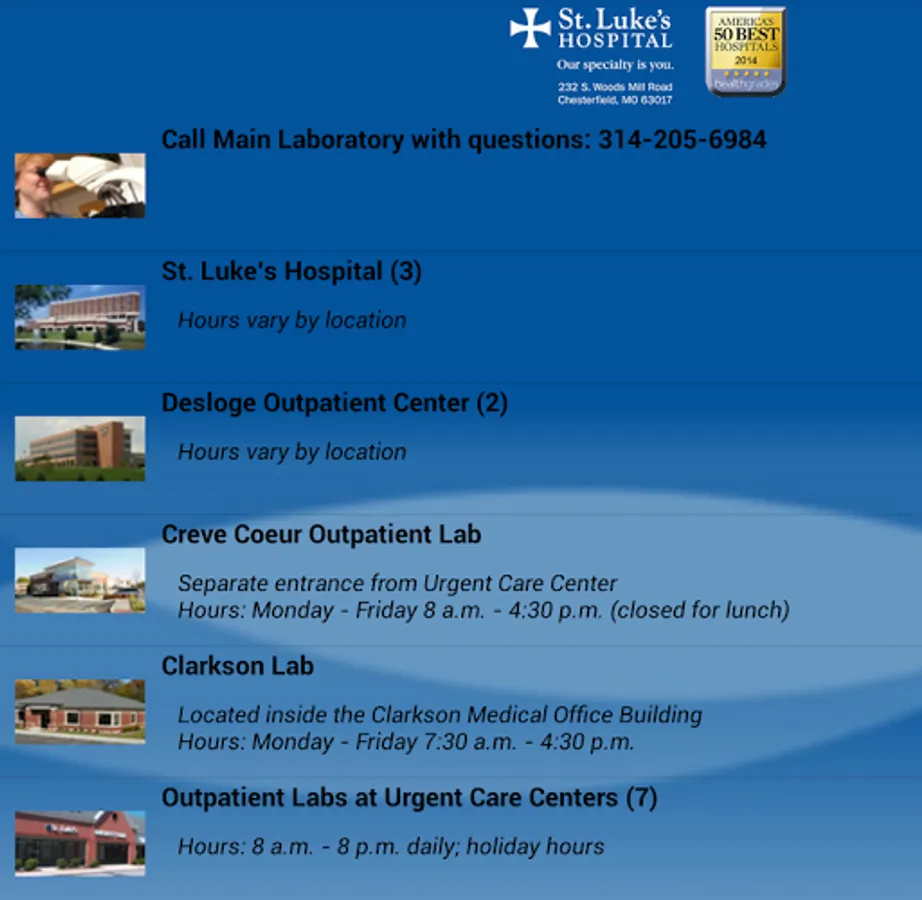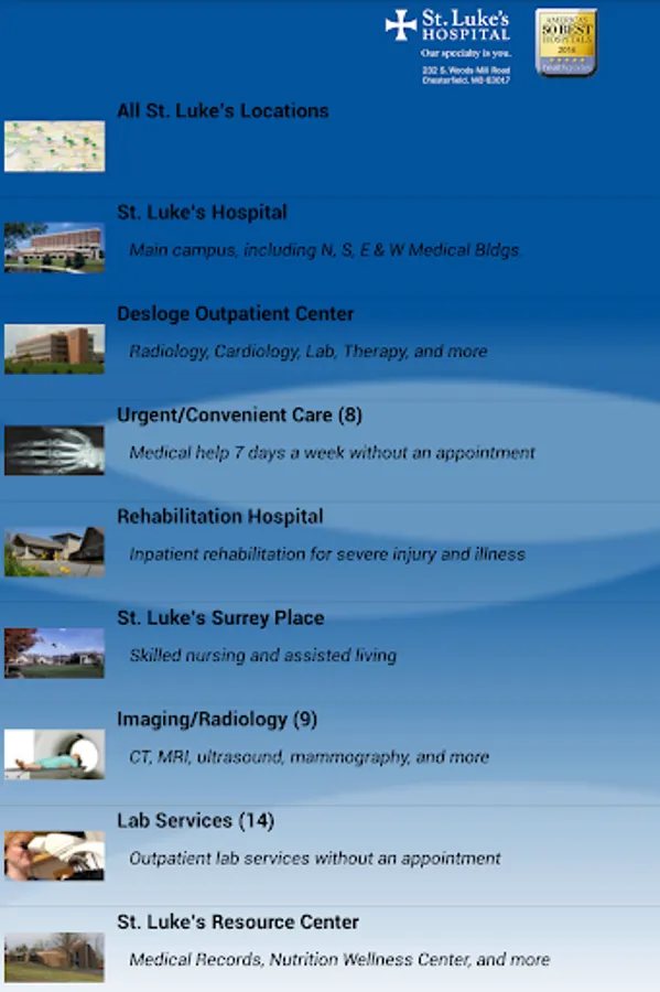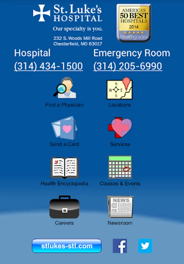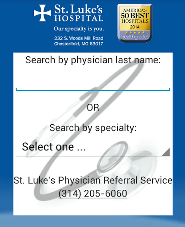 Quick, on-the-go access to physician information, emergency numbers, locations, directions and more for St. Luke's Hospital in Chesterfield, Missouri. Use the "Find a Physician" search to find a physician in any of 60 specialty areas. Access directions and phone numbers to St. Luke's 20-plus locations, including our Urgent Care Centers, imaging locations and outpatient facilities. Conveniently send an e-card to a patient in the hospital. Check out upcoming events and classes. Access a health encyclopedia for first aid information, a symptom guide, self care tips and more.
