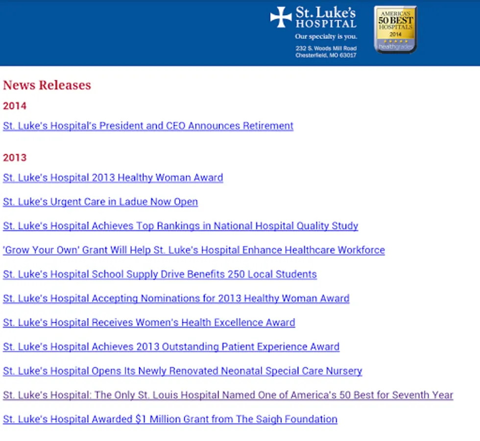St. Luke's Hospital in Chesterfield, Missouri (greater St. Louis area), is a 493-bed, not-for-profit hospital offering more than 60 specialty areas. St. Luke's Hospital is recognized as one of America's 50 Best Hospitals by Healthgrades (2007-2015), ranking among the top one percent of hospitals in the nation based on superior clinical quality.