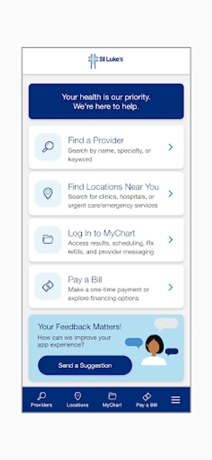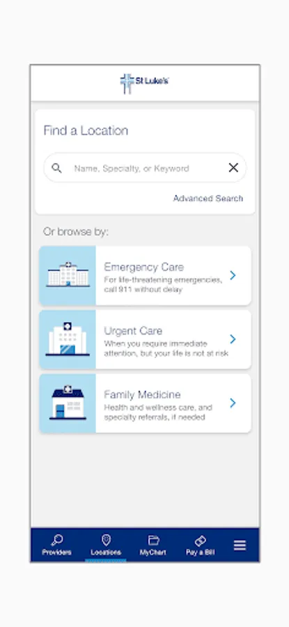 Connect with St. Luke’s to access high quality primary and specialty health care. Whether you’re looking to establish long-term care with a provider or need more immediate support, we can help you find care that meets your needs. This app also links to your MyChart account, making it easy for you to view test results, contact your provider, request medication refills, schedule appointments, and more. You can even link to St. Luke’s Bill Pay to make a one-time payment or explore financing options.