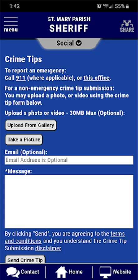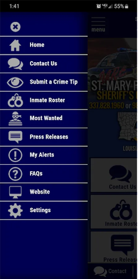 The app has public information for press releases, inmates, most wanted, special alerts, and FAQ's. Crime tips and contact us messages can be sent to the Sheriff's Office.