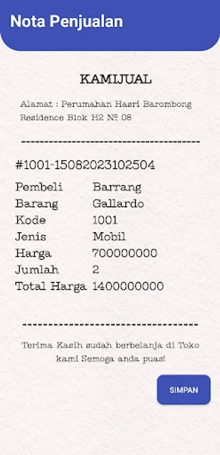 This application is made to make it easier for sales, traders or sellers to be able to manage sales and set prices that have been adjusted. With this application, all sellers will feel that their sales will no longer feel dizzy, because they have used this application. Only by interacting with a cellphone can you record sales history, if you want to check sales, all you have to do is look at your cellphone!