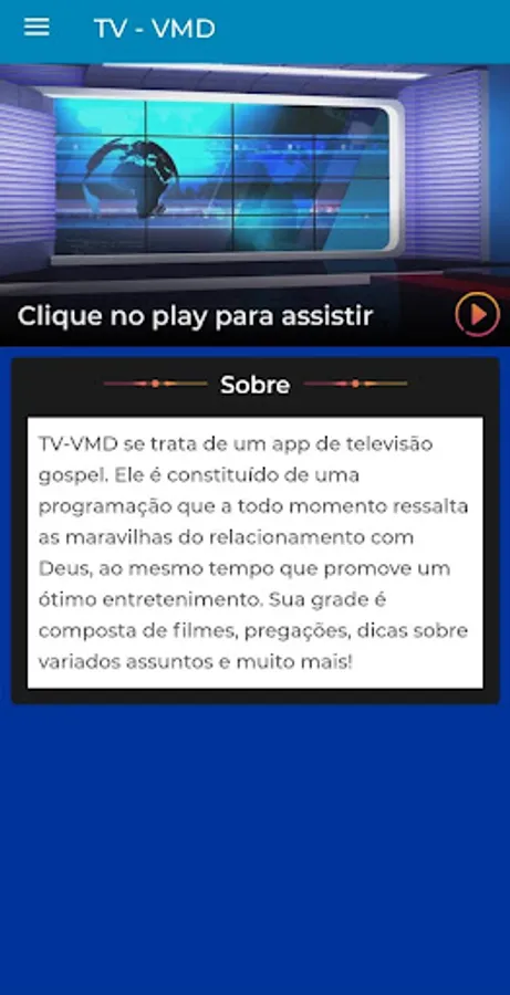TV-VMD is a gospel television app. It consists of a program that at all times highlights the wonders of the relationship with God, while providing great entertainment. Its grid is made up of movies, sermons, tips on various subjects and much more!