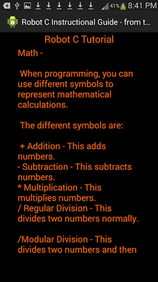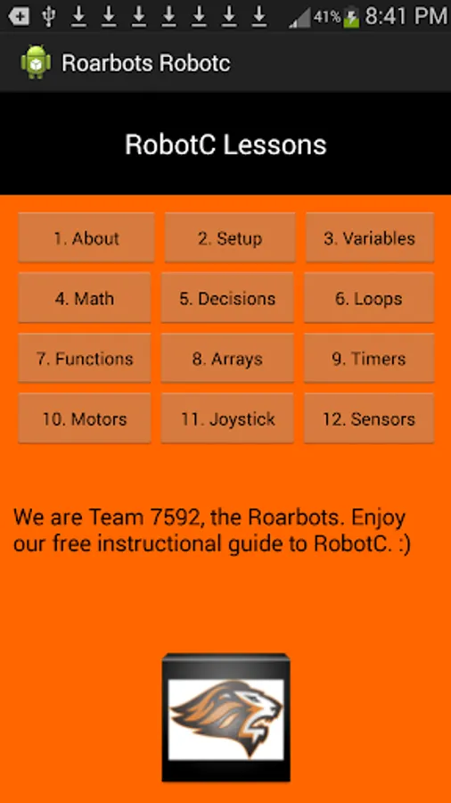 This is a free RobotC Instructional Guide from Team 7592 The Roarbots. We are a robotics team from Oviedo High School that is apart of an organization called FIRST. Every year, there is a specific game that we compete in, and we build, design, and program a robot to play that game.