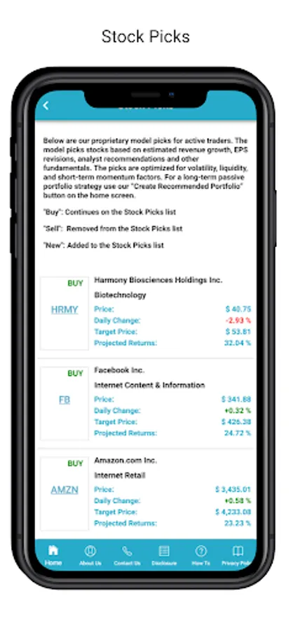 Daily updated stock picks with target prices (about 10 to 15) for users to choose from. Buy, Sell, New labels provide action recommendations and stock alerts.