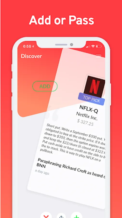 Focus on the top picks. Browse the top picks and swipe left to add to your watch list or right to pass to the next stock.