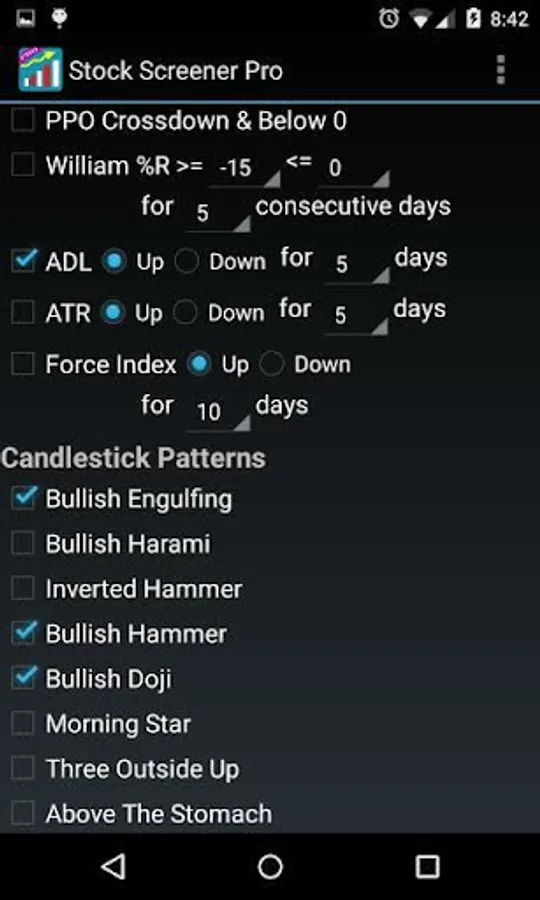 1. The Stock Screener Pro allows you to combine multiple technical indicators and scan the stock market. This will save you a lot of time as you no longer need to scan technical indicator one by one. For example, you can search for stocks trading in the range of $5-$10 with volume 100,000-1,000,000 that formed a bullish engulfing pattern and a macd crossover with one shot. It takes only a few seconds to get you the result sets you desired.