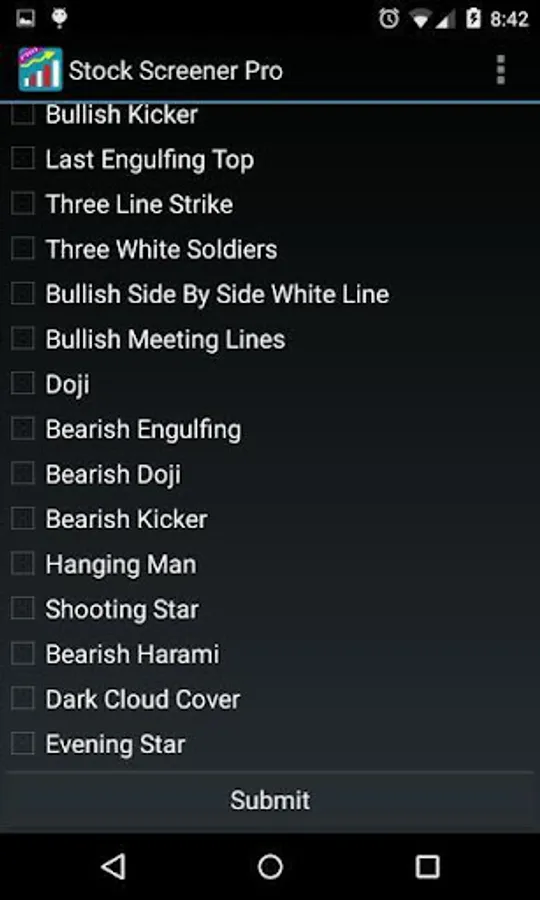 Below is a list of the most popular stock chart patterns and technical indicators that you can use with our stock screener app.