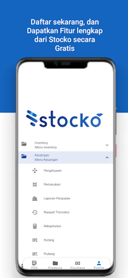 Stocko is a cashier / POS application that is equipped with a warehouse management system to view stock flow and purchase flow, so that product stock flows are more detailed.