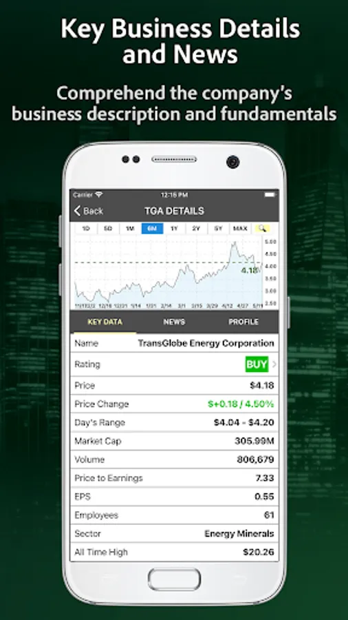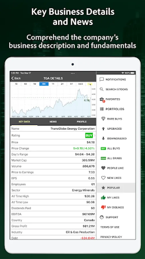 • Touch the profile, metrics, and history tabs to see the company’s business description, fundamentals, etc.