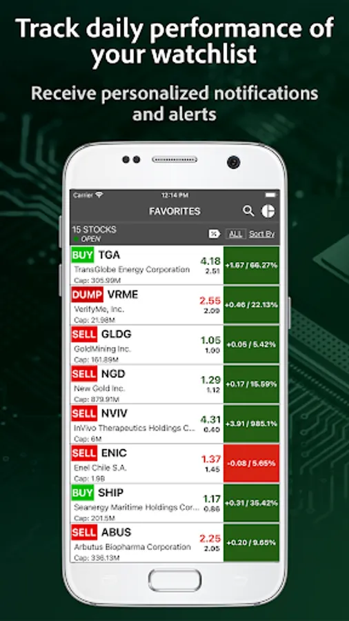 • Color-coded sparklines allow you effortlessly track stock performance throughout the day.