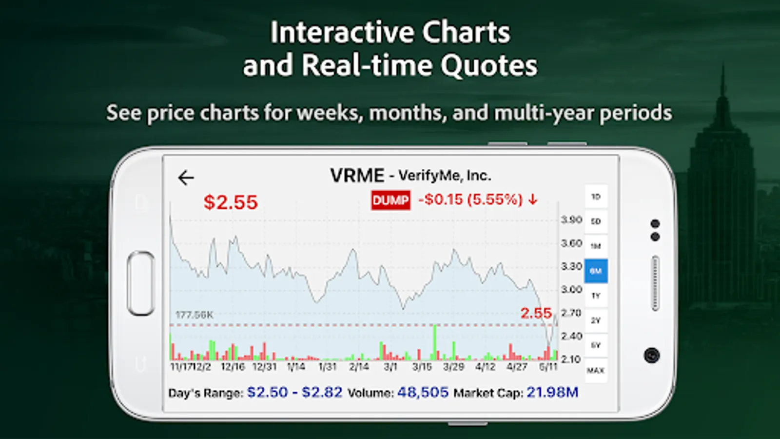 • Tap any ticker in any portfolio to see price charts for weeks, months, and multi-year periods.