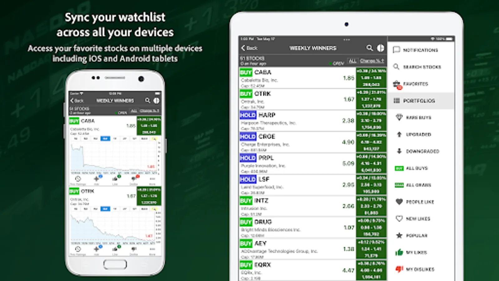 • Add stocks with Buy ratings to your watchlist and sort them by daily gains, trading volume, volatility, etc.