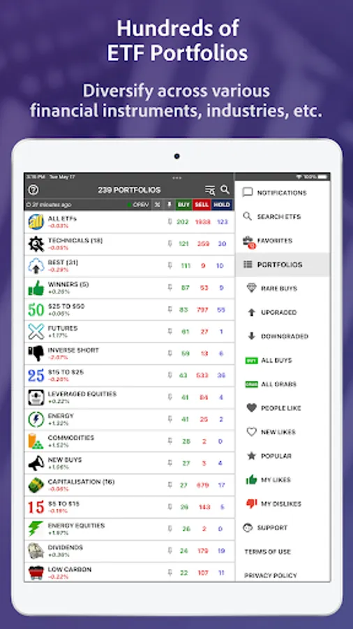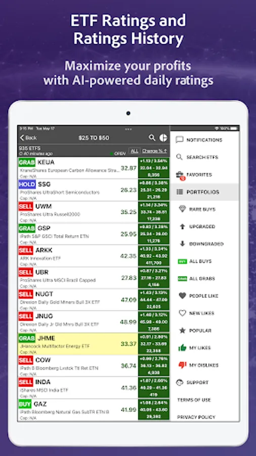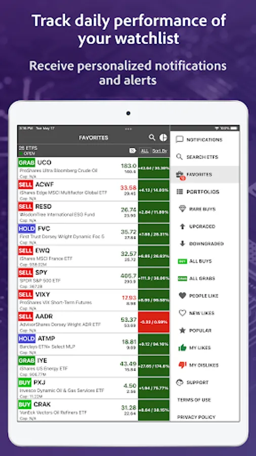 • Add ETFs with Buy ratings to your watchlist and sort them by daily gains, trading volume, volatility, etc.