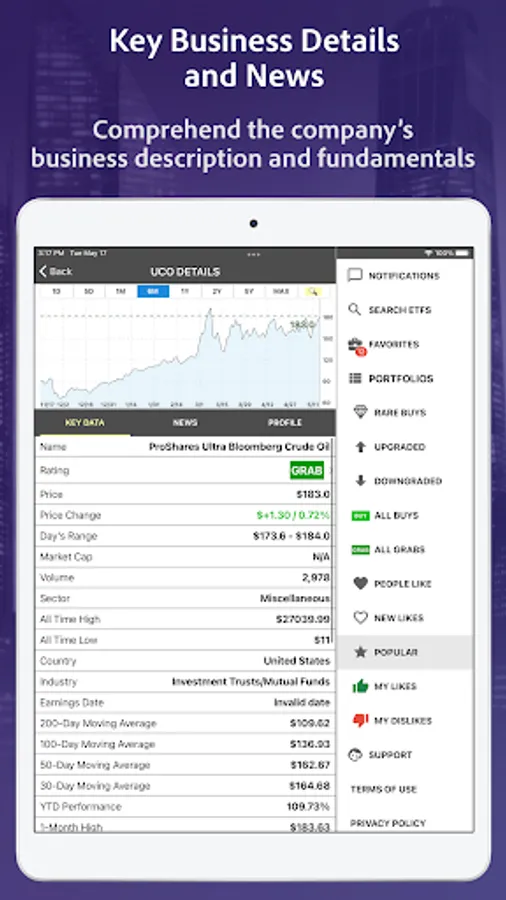 • Touch the profile, metrics, and history tabs to see the ETF business description, fundamentals, etc.
