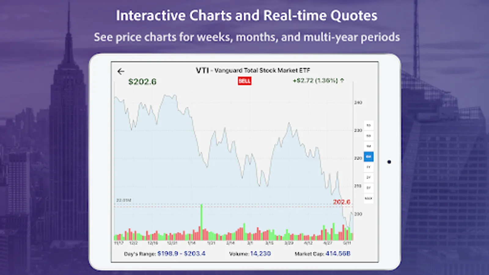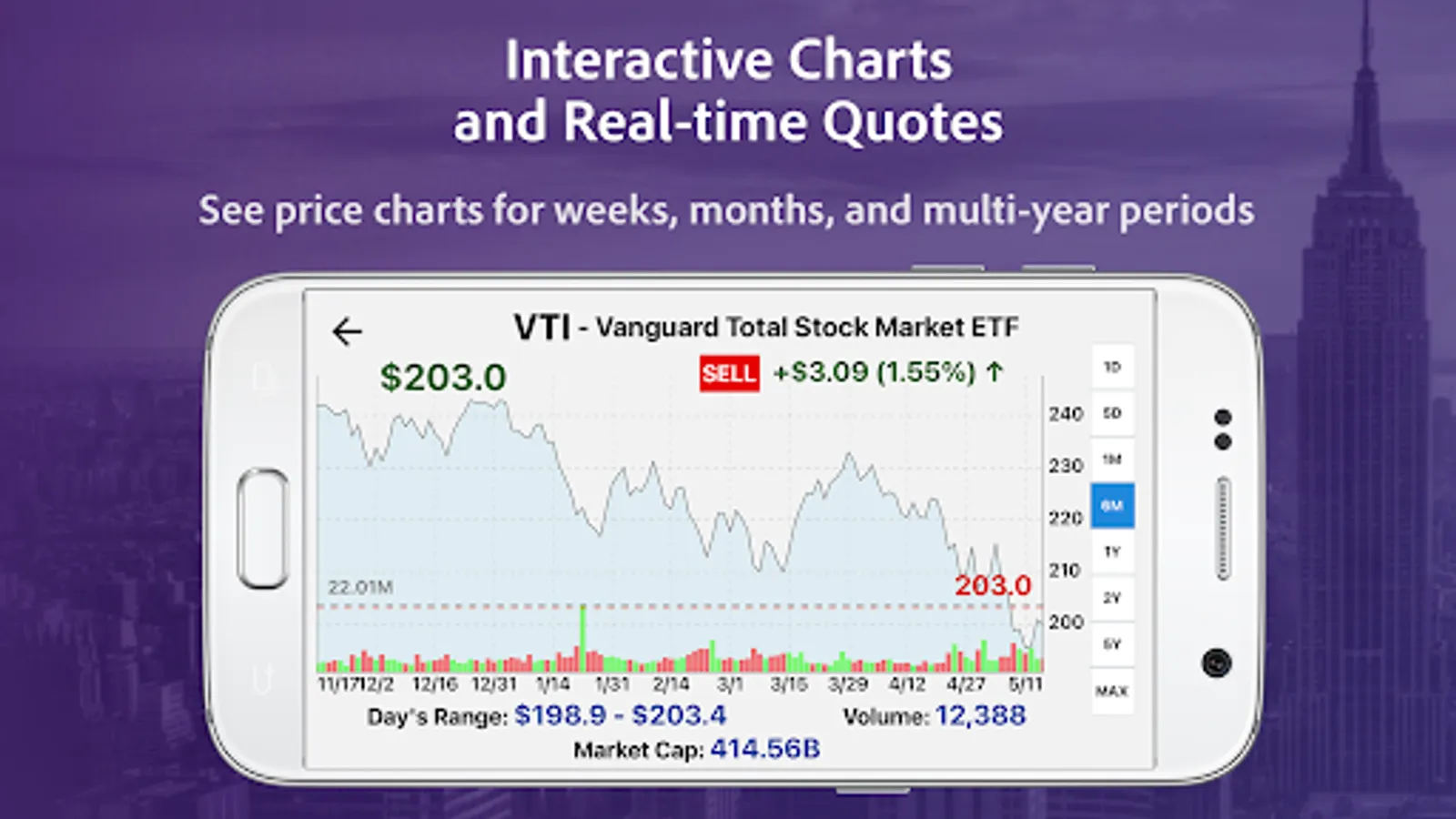 • Tap any ETF ticker in any portfolio to see price charts for weeks, months, and multi-year periods.