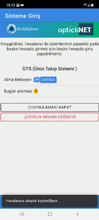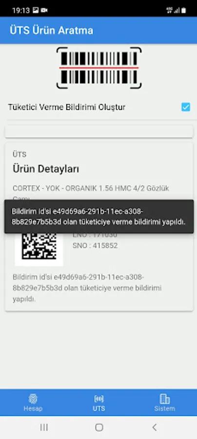 The application can make product inquiries and notification of purchase and delivery for your products by scanning the data matrix through the Stock System and OptickNet accounts and the Product tracking system. It can convert the product notifications sent to you individually or collectively into receiving notifications, either query the scanned QR codes or if Create export notification is selected, it finds the product in the system and converts it into a delivery notification. In order to carry out transactions, they must have a StokSistem or OptickNet account and have received a system token from the Product Tracking System.