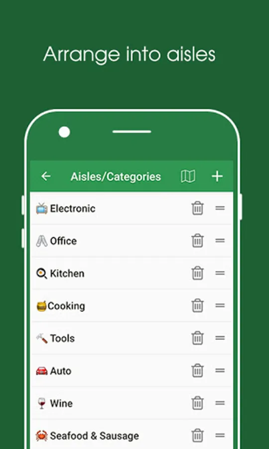 👉 Each list is for shopping at a store, items can be grouped by category. Then, categories can be sorted as you want. This way saves you from go back to an aisle to take a missing item and get away from impulse buying while shopping in-store.