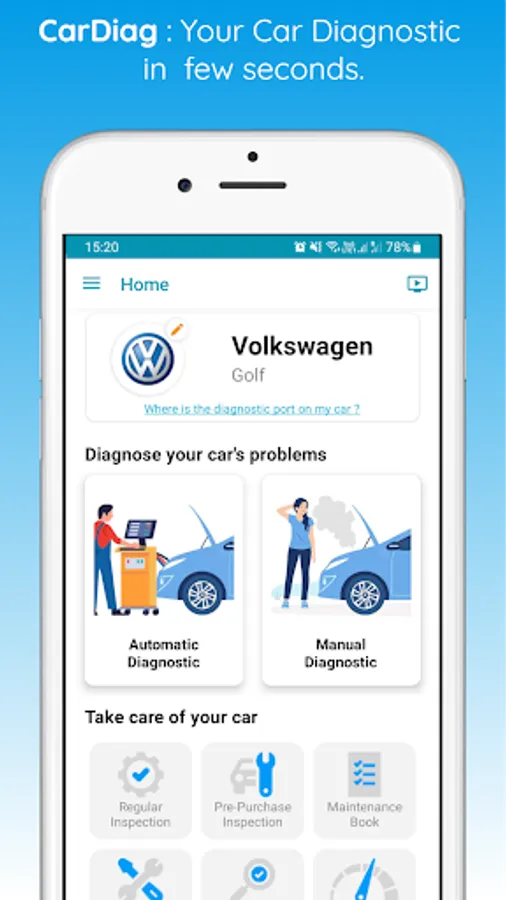 The "CarDiag" application supports motorists from "A" to "Z" in the diagnostic, maintenance and repair of their vehicle independently and cheaply : since the doubt of a problem, the identification of the fault, a diagnostic in simple and easy-to-understand terms and a pollution score, Do-it-yourself auto repairs, tips to buy parts as well as a cost estimation at the nearest mechanic. It also provide a digital maintenance book.