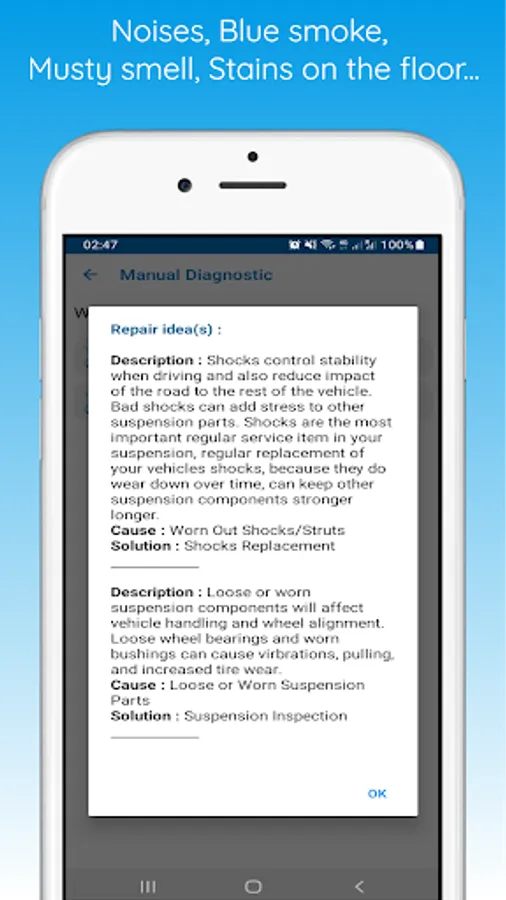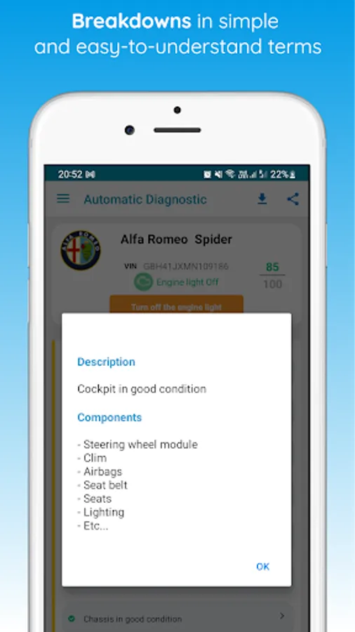 - Automatic Diagnostic OBD2: Equipped with an OBD2 bluetooth device (easy to get and available for less than 10$), CarDiag provides a complete list of your car problems in simple and easy-to-understand terms.