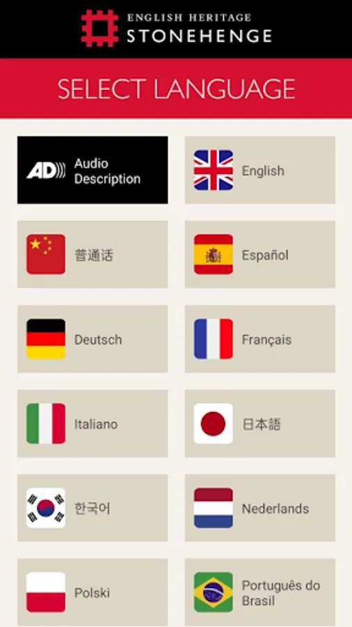 The free multi language audio guide for use when visiting Stonehenge. Easy to download with a choice of thirteen language versions. Use your own smart phone and headphones to explore the most famous prehistoric monument in the world, the surrounding landscape and Visitor Centre exhibition where you can uncover the story of Stonehenge through over 250 archaeological finds on display.