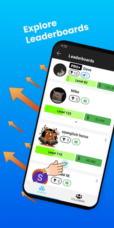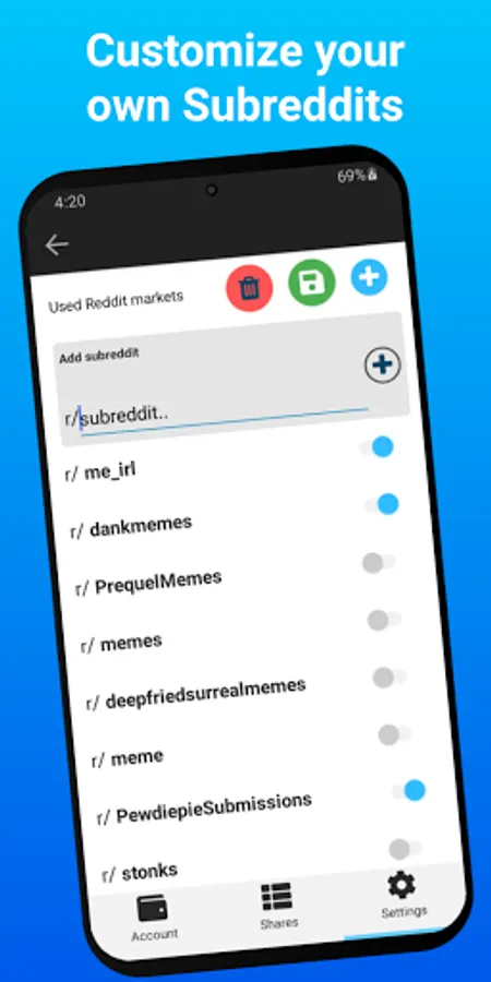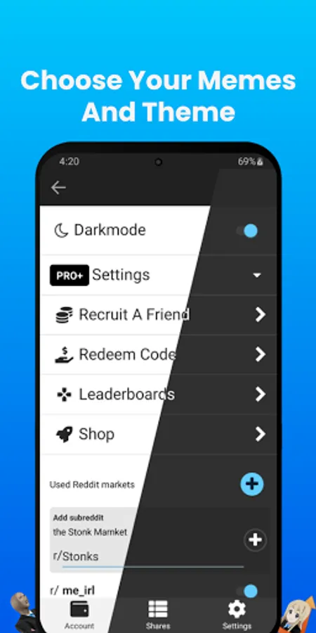 Explore all subreddits full of memes and share your favorites with your friends. With Stonks Pro, you can level up and become the best Meme investor, compete on the leaderboard, and earn free rewards and ring badges. Collect Achievements and flex with your badge rings, and enjoy special settings like Darkmode.