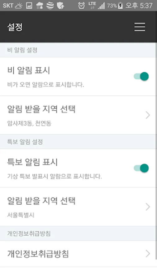If Korea Meteorological Administration announces warning of heavy weather, Weatheri will push the alarm to your mobile phone.