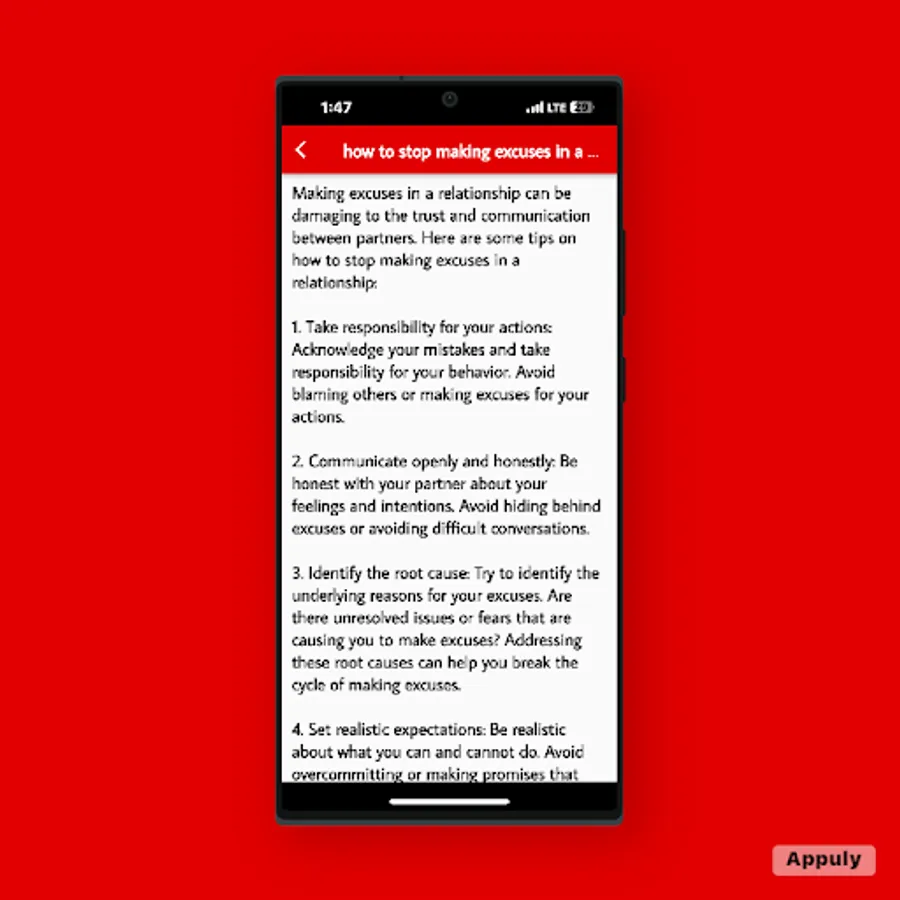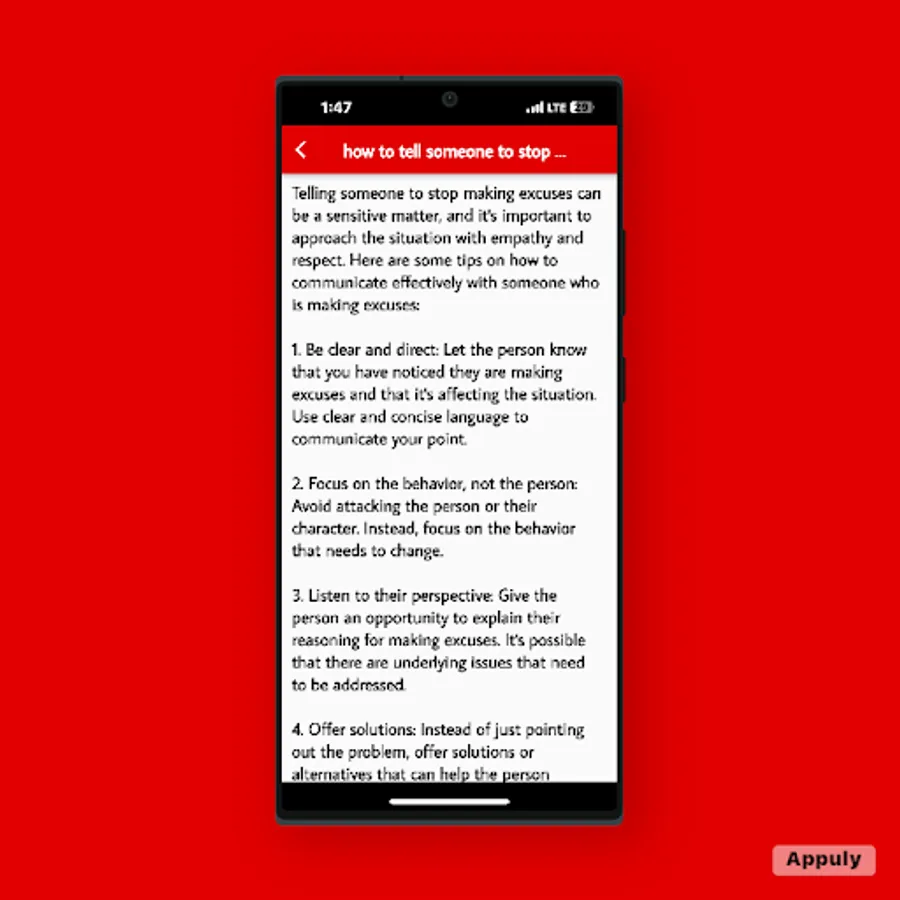 Learn how to effectively communicate with others who are prone to making excuses. The app provides practical advice and strategies on how to address the issue without judgment or confrontation. Gain insights into effective communication techniques that encourage personal growth and accountability while fostering healthy relationships.