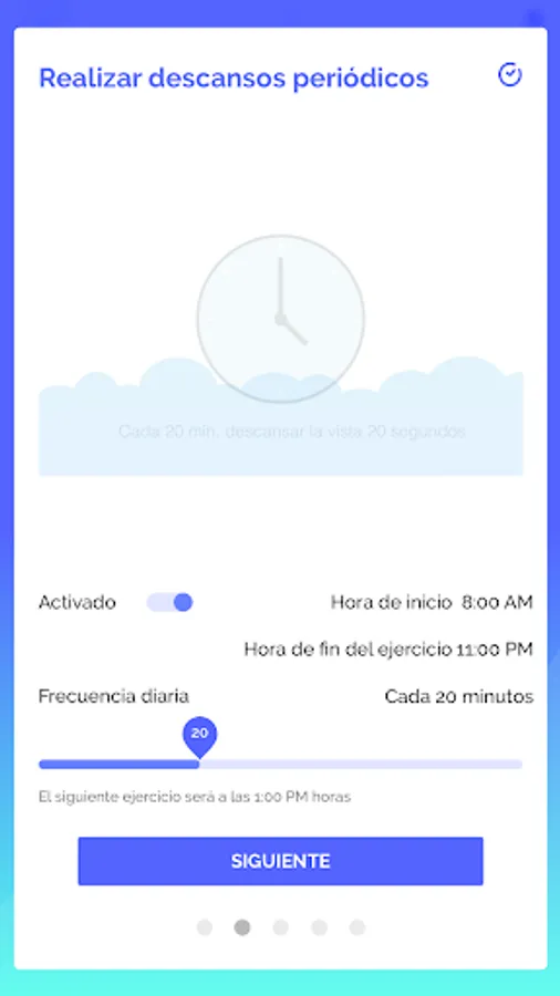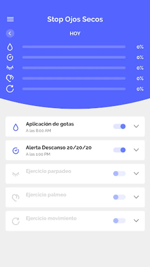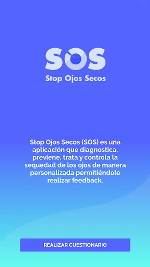 The app starts with performing a short questionnaire to determine the degree of eye dryness. Then recommends the frequency of administration of artificial tears and eye exercises that the user can enable and configure to your needs, facilitating feedback. Finally, it generates a report of the progress of treatment preselection of the period you want to analyze. You can send this report to your ophthalmologist via WhatsApp or e-mail, as well as allowing the appointment.