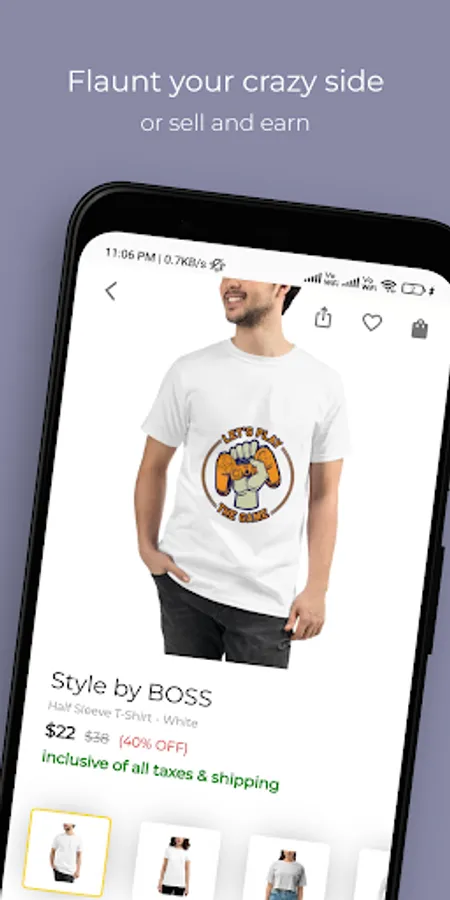 You can upload your art or design t-shirts, crop tops, hoodies, or sweatshirts inside the app, and publish it for the buyers in your storefront with your desired profit and start sharing it on social media like Instagram, Facebook, WhatsApp to sell fast.