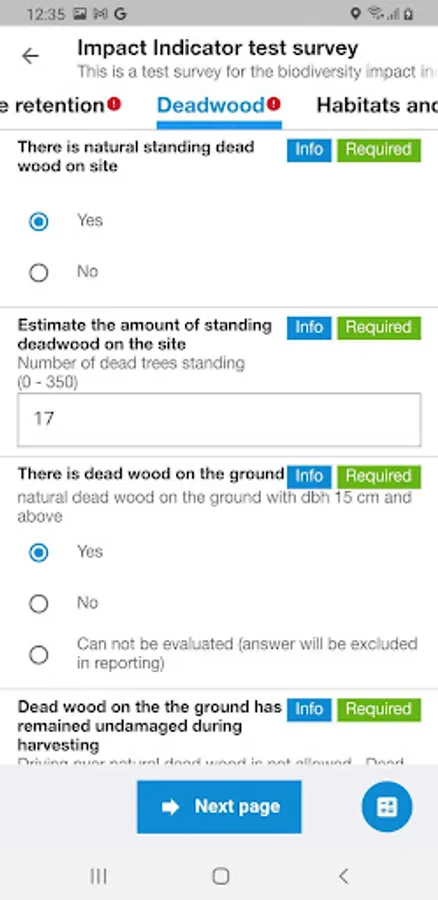 Application is used for data collection to evaluate site specific harvesting impact, i.e., on biodiversity.