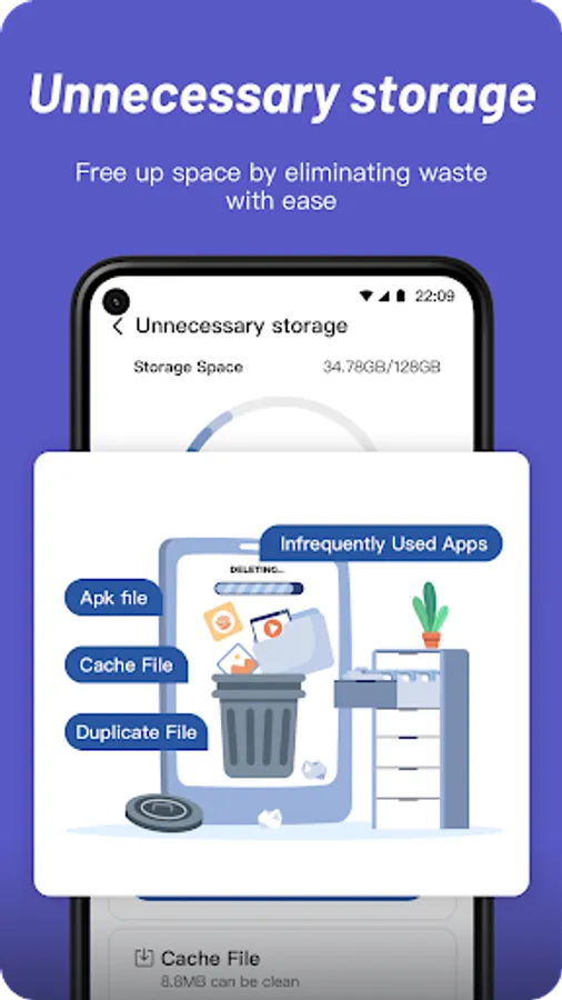 Delete duplicate files, clear system cache files, delete installation packages, and manage unused apps.