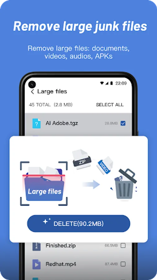 Find and remove large junk files, such as big documents, videos, audios, and APK files, to free up phone space.