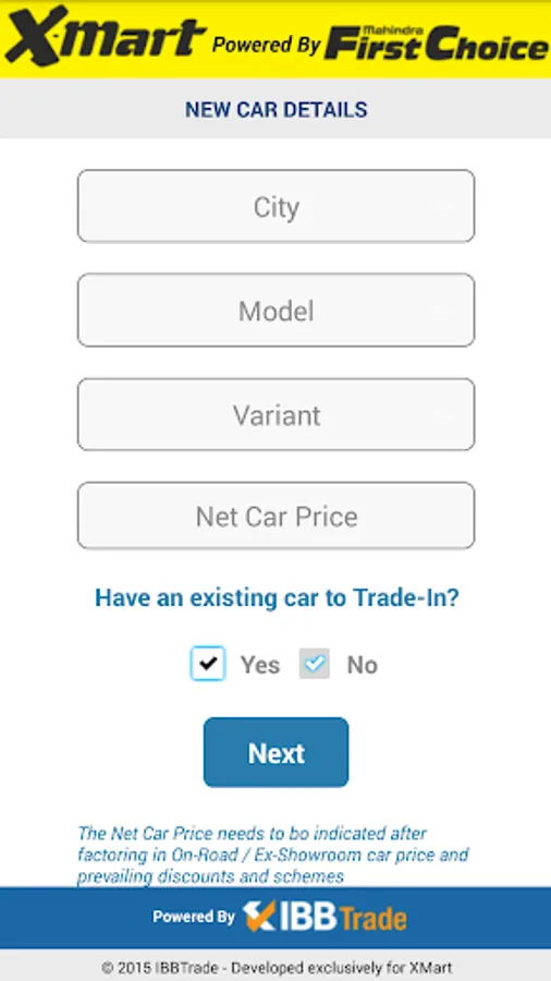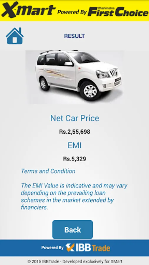 The application facilitates the interaction with walk-in customers at auto dealerships of Mahindra & Mahindra Ltd. Integrated with IndianBlueBook (IBB) at the back end, the app provides pricing guidance on the trade-in value of a car, does loan EMI calculations and helps to sell the trade-in car via the IBBTrade platform
