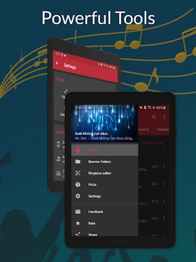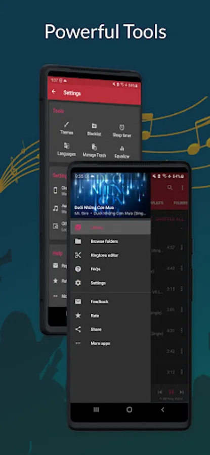 - Other powerful settings and customizations: Blacklist folders, Hide short songs, Trash, Sort or hide tabs...