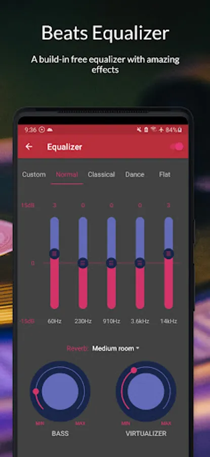 - Beats Equalizer: A build-in free equalizer with amazing Presets, Bands, and 3D reverb effects adjustments.