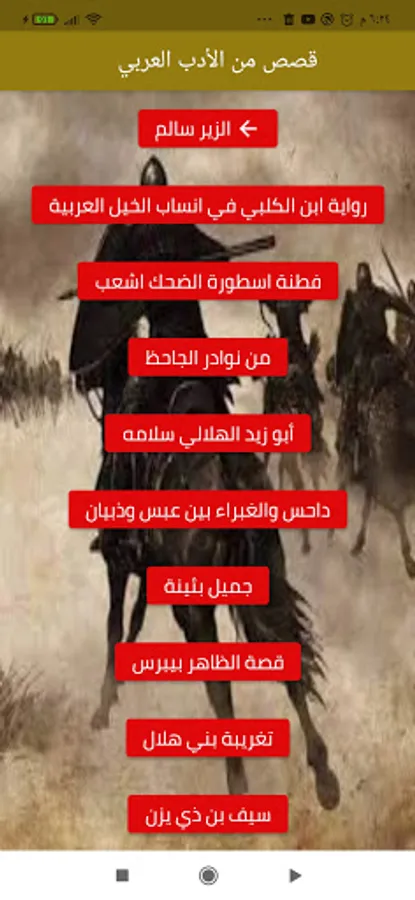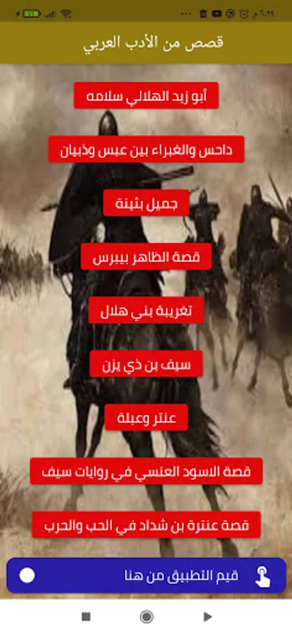 The application of stories from Arabic literature on the full story of Al-Zir Salem. Ibn al-Kalbi's novel on the Arabian horse lineage. Acumen legend laughter people. From the anecdotes of Al-Jahiz. Abu Zaid Al-Hilali Salamah. Paronychia and dust between frowns and Zbyan. Beautiful Buthaina. The story of Al-Zahir Baibars. The alienation of Bani Hilal. Saif bin Dhi Yazan. Antar and Abla. The story of Al-Aswad Al-Ansi in Seif's novels. The story of Antarah ibn Shaddad in love and war.