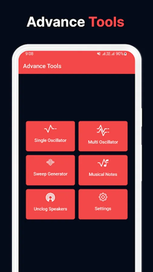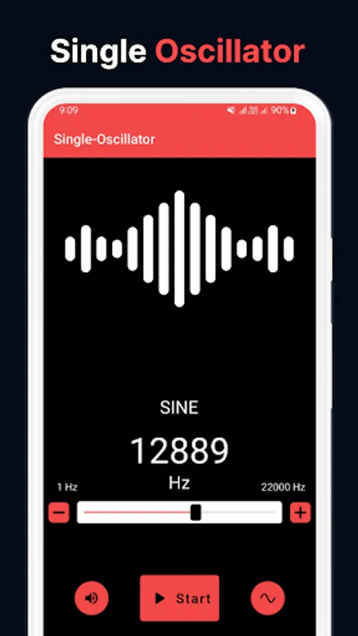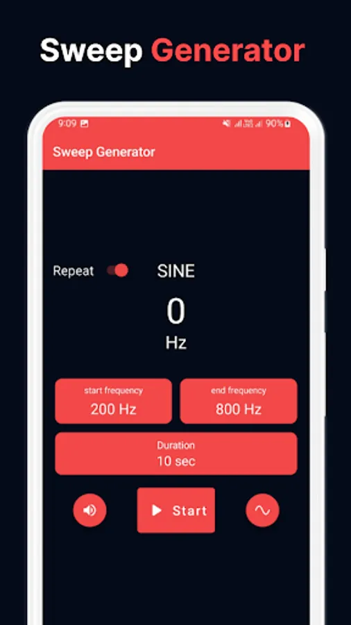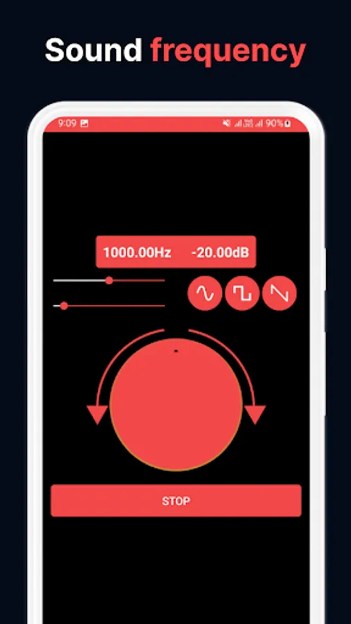 Frequency Sound Generator allows you to easily change the soundwaves from the main menu. Simply tap on the sound wave icon and pick between sine, square, sawtooth or triangle. Additionally, pick from a wide variety of notes by taping the notes 🎵 icon.