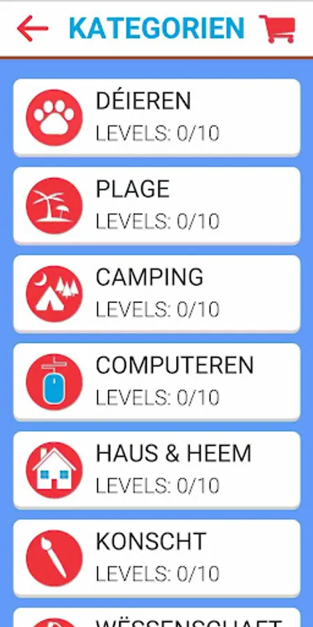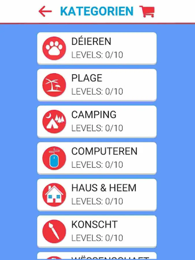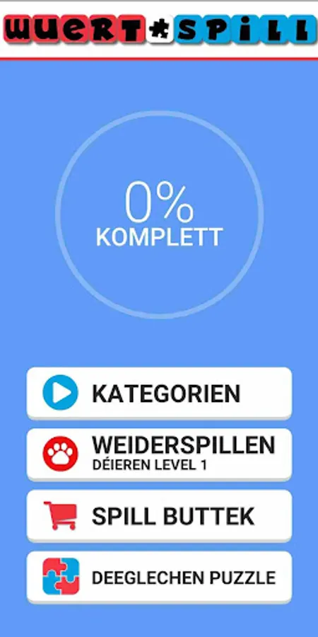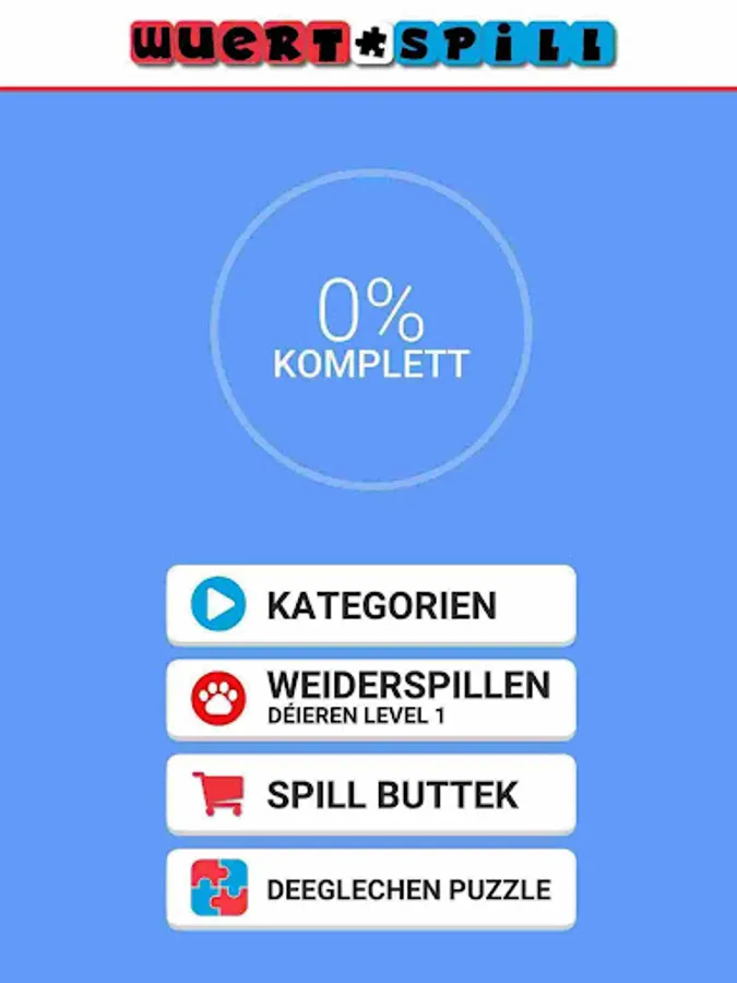 The first ever word puzzle game in Luxembourgish. Find Luxembourgish words in ten categories of ten levels each and 100 daily puzzles. Drag your finger across the screen to connect the letters and find the correct words. Each topics and that give you a hint towards the words you need to find. Have fun solving the puzzles, more will be added later on. You can use hints/tips to help you solve the puzzles. For each daily puzzle you solve, you get one additional hint/tip (or buy them in the store).