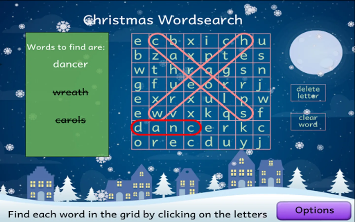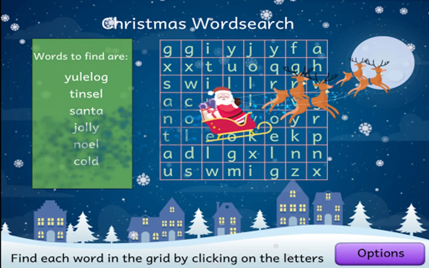 All the time while children are finding words, snow will come down, and when all the words in the grid have been found, Father Christmas on his sleigh will cross the screen!