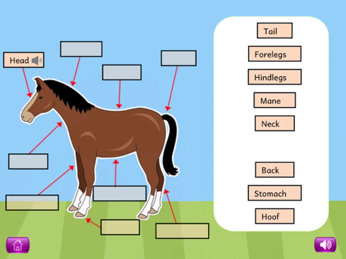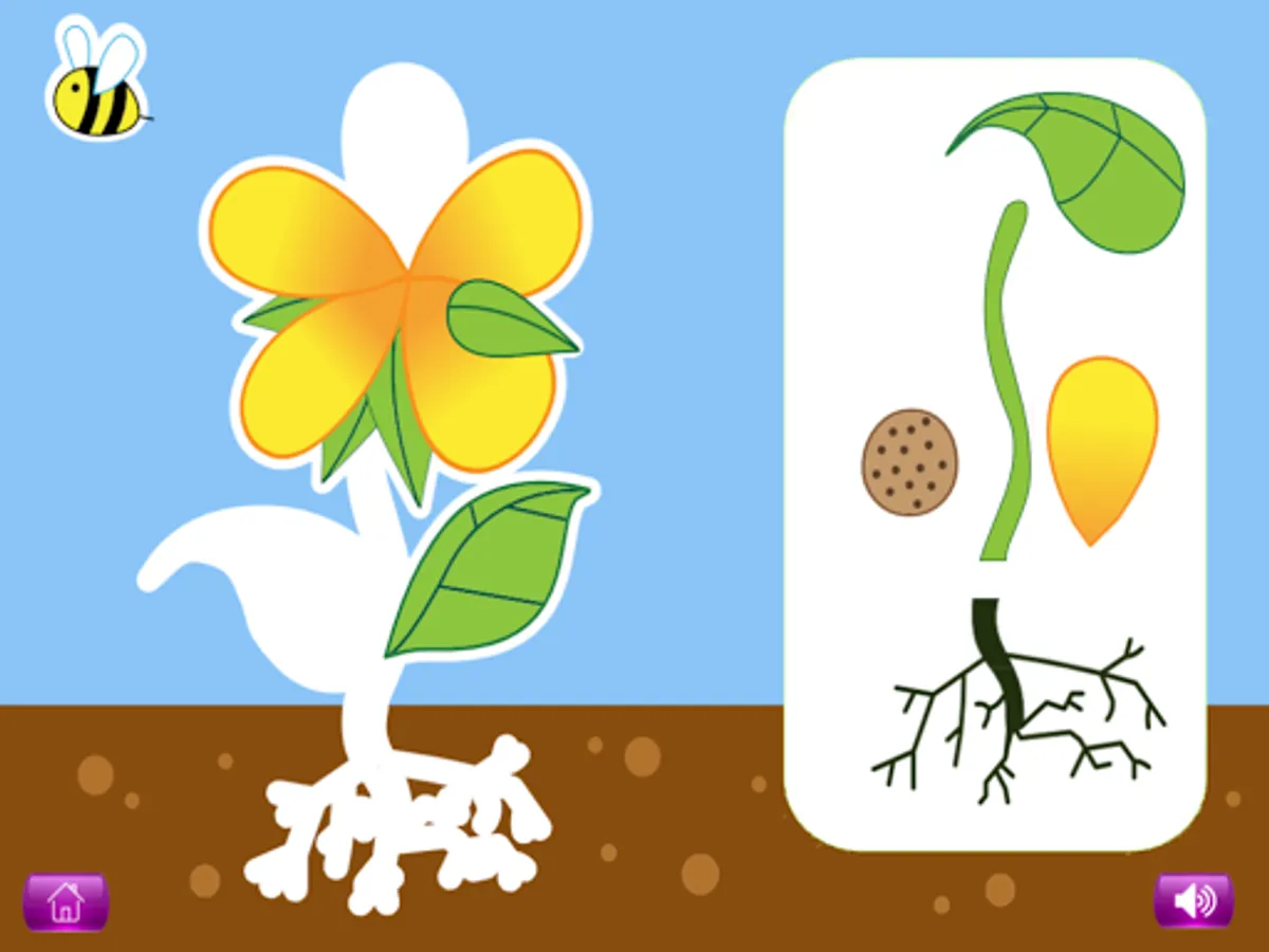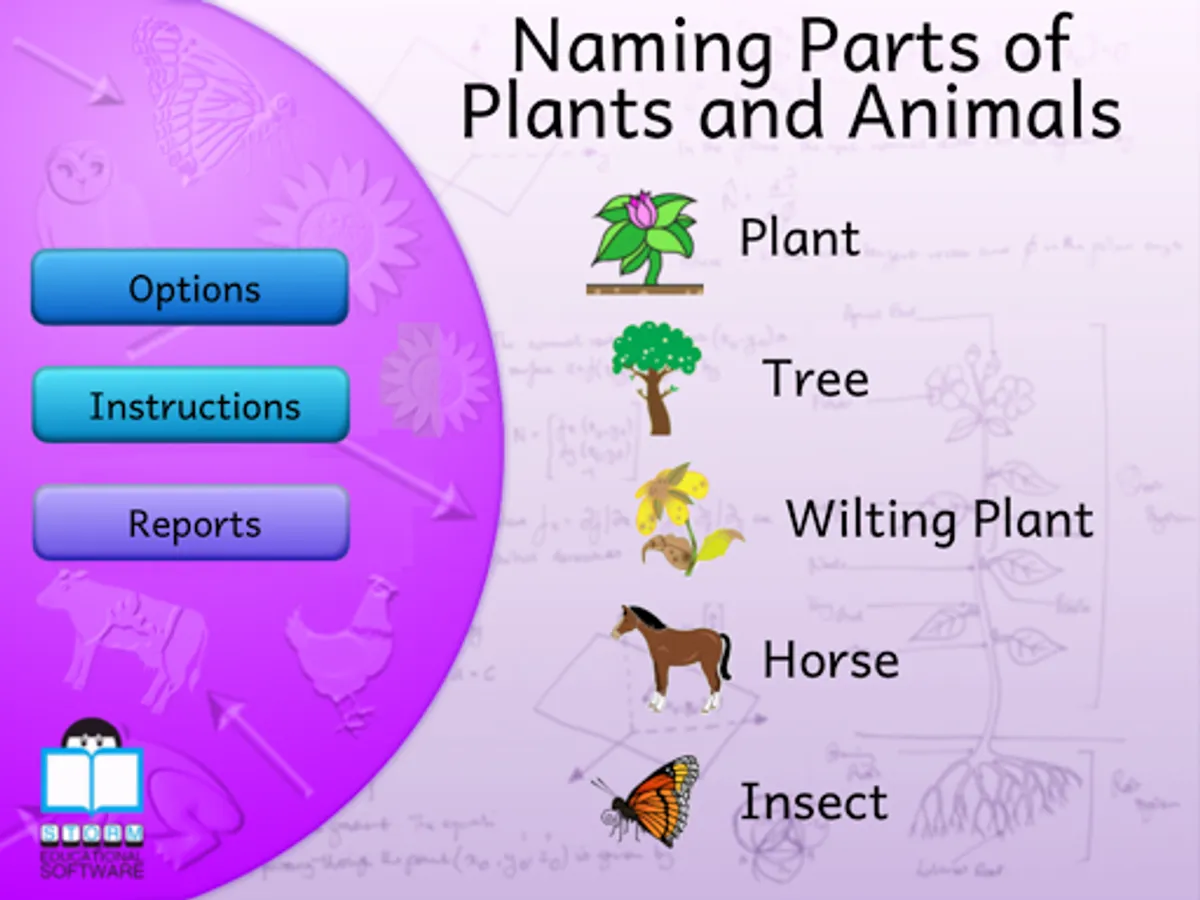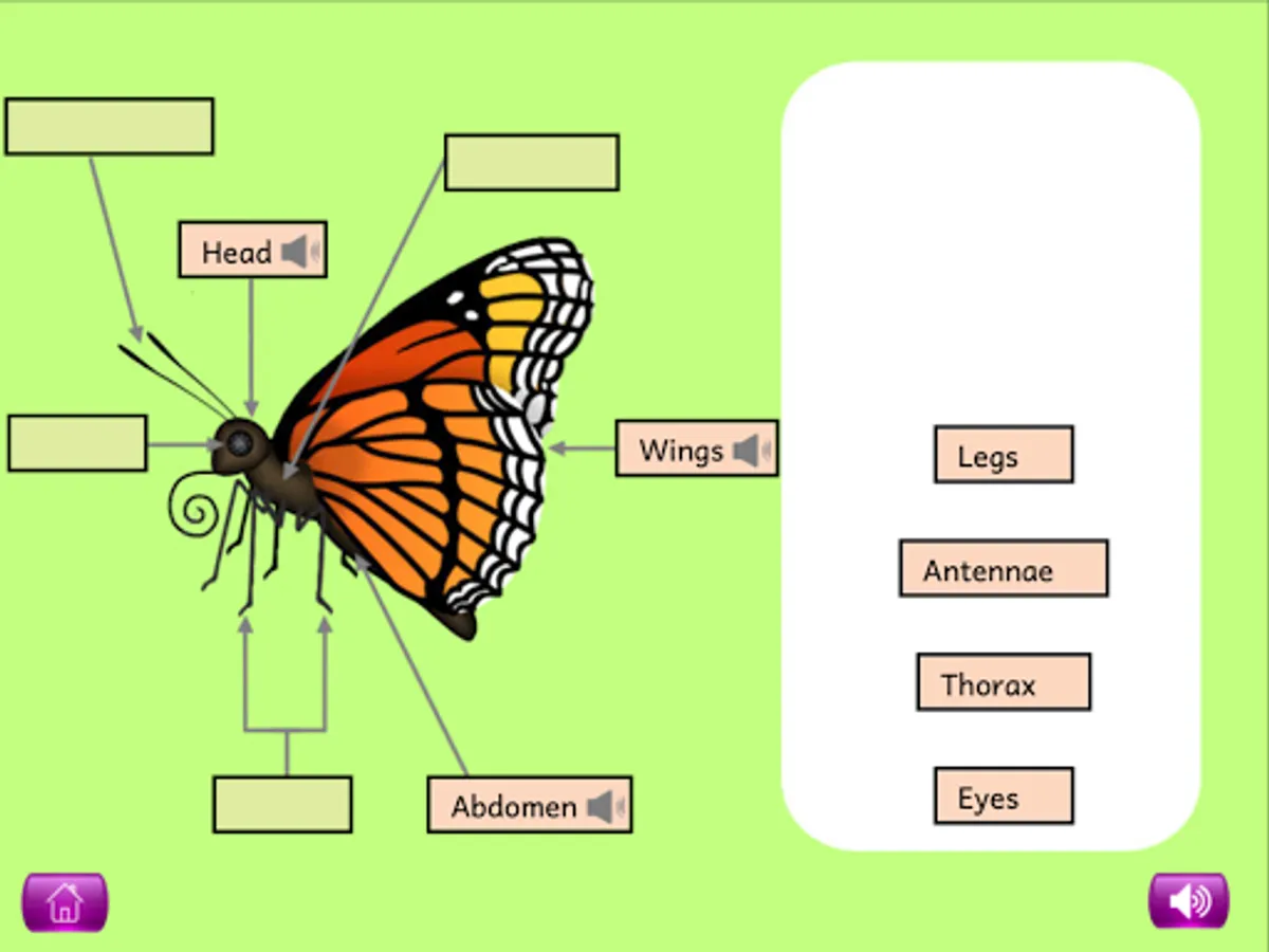 For each of these topics, a picture shown on the screen is completed by dragging the different parts (eg with a flower: petal, leaf, roots, stem etc.) from the right of the screen and placing them into the correct position. When all of the parts have been placed, labels can be added, and children can click on the labels to hear and read more about that part of the plant or living creature.
