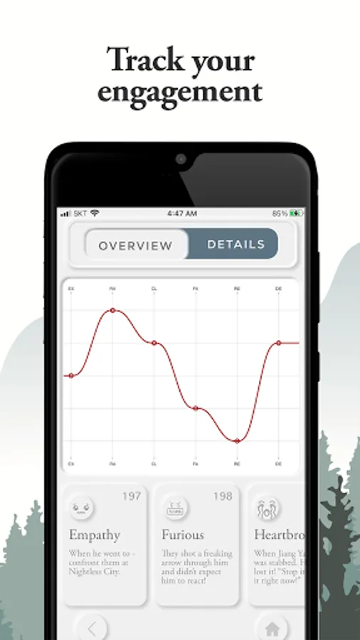 * The line graph visually presents the dips, rise and plateau of your engagement with the story for speedy assessment, review and revisits.